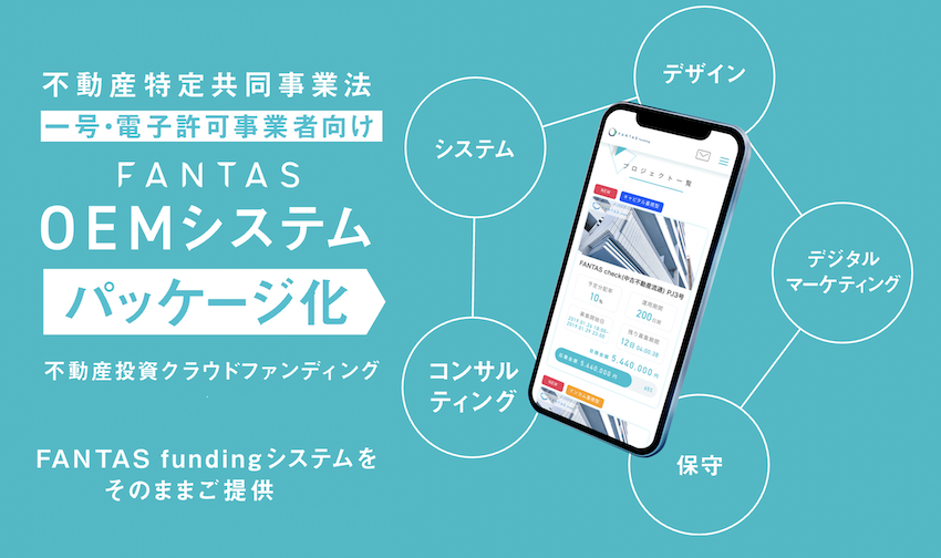 「FANTAS OEM システム」は、不動産投資型クラウドファンディングサービスを始めたい企業向けに、システム開発から運用体制の構築、広告運用等の代理業など、運用までを支援するサービスです。本サービスはOEM提供のため、自社ブランドを生かした不動産投資型クラウドファンディングサービスの開発が可能です。なお、本サービスは、FANTASが運営する不動産投資型クラウドファンディングサービス「FANTAS funding」のシステムやノウハウを活用したものです。