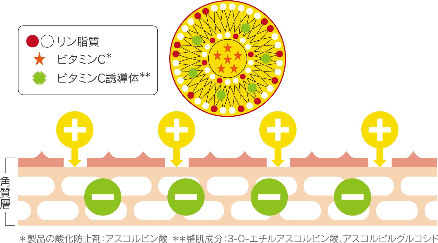 リポソームは肌の構造成分と同じリン脂質からなり、そのままで は浸透しにくいビタミンCを肌へなじみやすくしています。さらにカプセルをプラスイオン化することで、マイナスイオンの性質をもつ肌へのなじみをより高めることに成功しました。