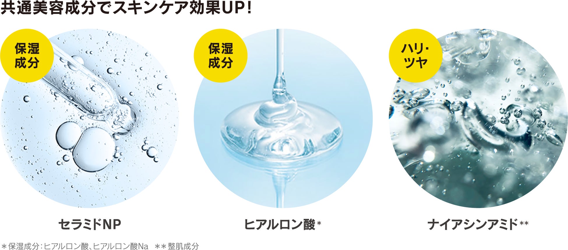 ビタCプラス*1美容液・同化粧水それぞれに配合した成分に加え、シリーズ共通成分でより高いスキンケア効果を目指します。 みずみずしくうるおいで満たされた肌へ導きます。