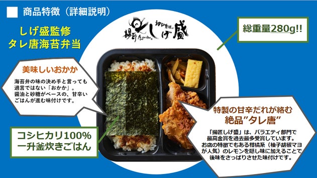 からあげグランプリ最高金賞最多受賞店舗*と海苔弁の最強タッグが実現!中津からあげのレジェンドからあげの鳥しんは王道の「醤油からあげ」、神戸の揚匠しげ盛は特製たれを絡めた「タレ漬け唐揚げ」。絶品唐揚げと子どもから大人まで愛される海苔弁のコラボを実現しました。