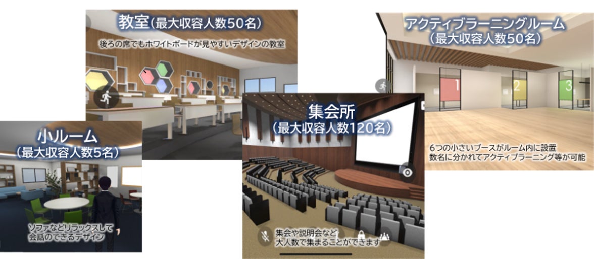 実証にて採用する3D教育メタバースは、探究学習やアクティブラーニング、他校との交流授業などで活用いただけるよう教室や集会所、小ルーム(面談室)、アクティブラーニングルームなど、教育に特化した仮想空間を提供しており、授業や全体集会、グループワークや面談といった学校特有の様々なシーンでの活用が可能なサービスです。