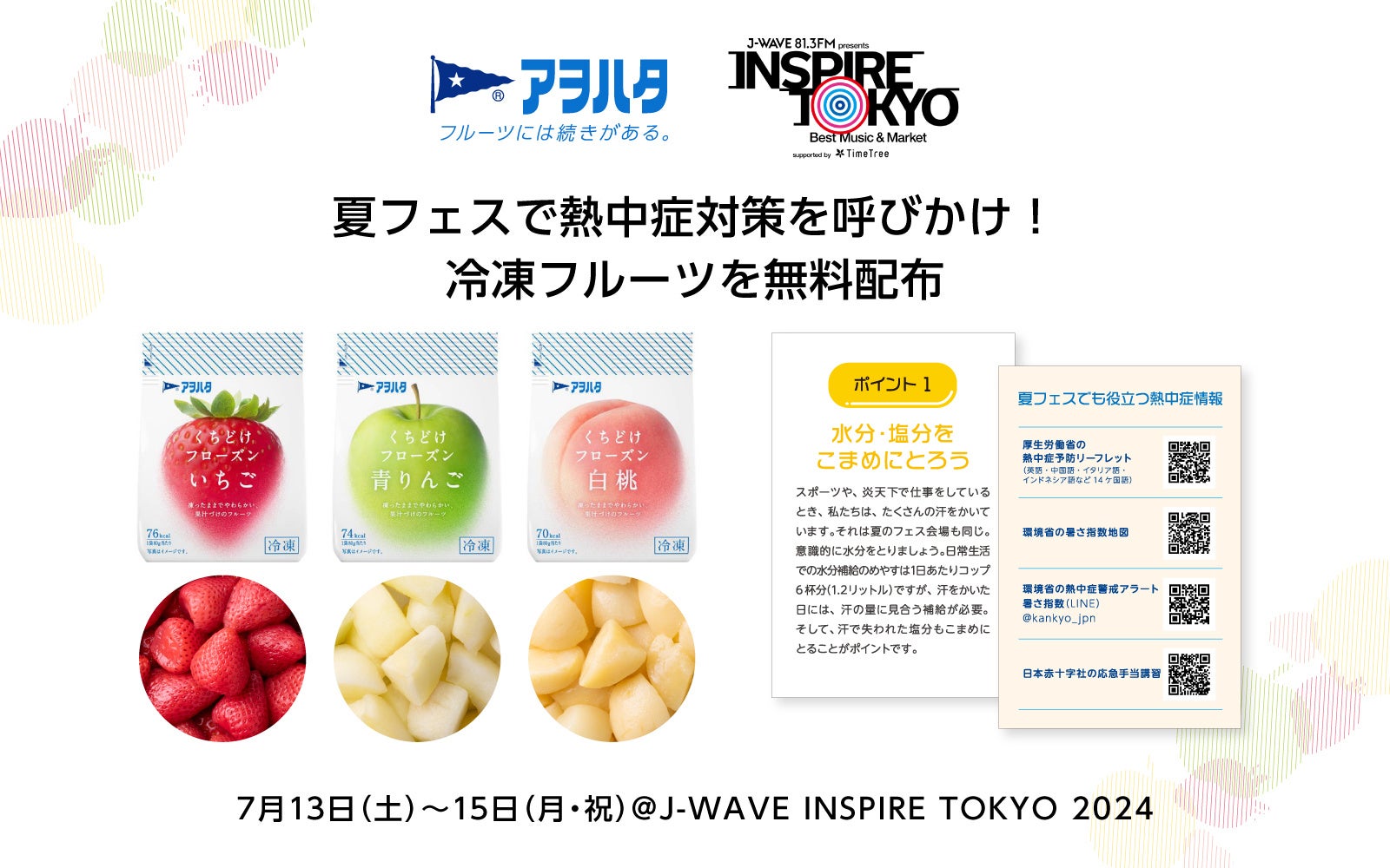 2024年7月13日(土)〜15日(月祝)に国立代々木競技場で開催される夏フェス「J-WAVE INSPIRE TOKYO 2024 -Best Music & Market- supported by TimeTree」で“凍ったままでやわらかい”冷凍フルーツ「アヲハタ くちどけフローズン」をフェスの来場者とスタッフに無料で配布します※1。さらに、医師監修の熱中症対策マニュアルも一緒に配布します。
