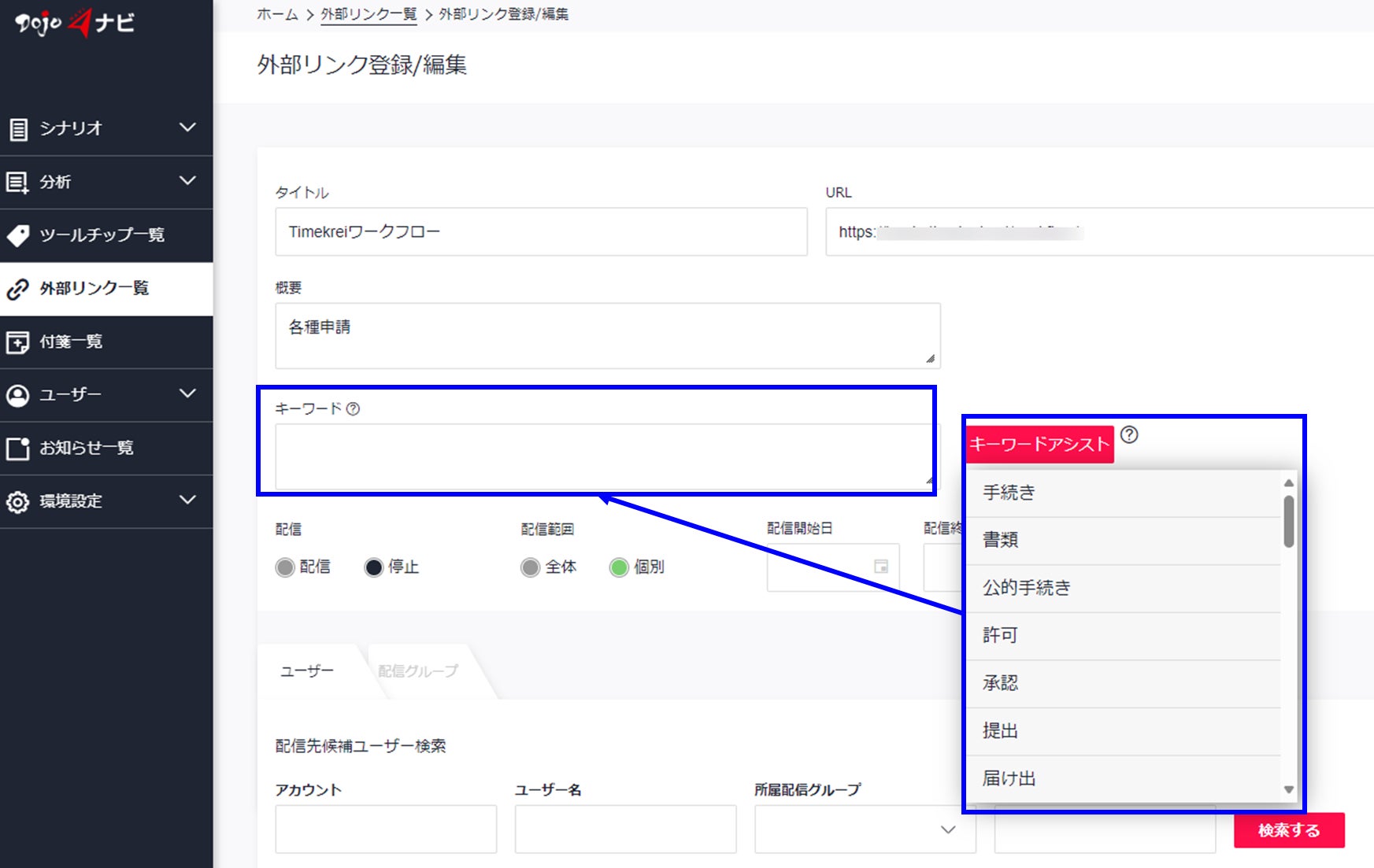 Webブラウザ上で画面操作のナビゲーションを表示する「シナリオ」や、ナビゲーションを表示しているWebページ以外へのリンクを登録する「外部リンク」の編集画面において、新設の「キーワードアシスト」ボタンを押すと、生成AIがタイトルや概要に入力した内容を基に「キーワード」の候補を列挙し、クリックするだけで「キーワード」を追加できる機能が実装されました。