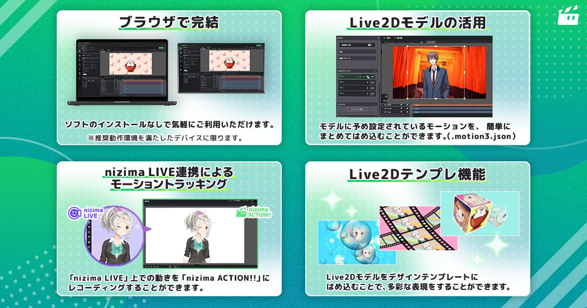 「nizima ACTION!!(ニジマ アクション)」とは、Live2Dモデルを存分に活用できる、オンライン動画エディターです。
