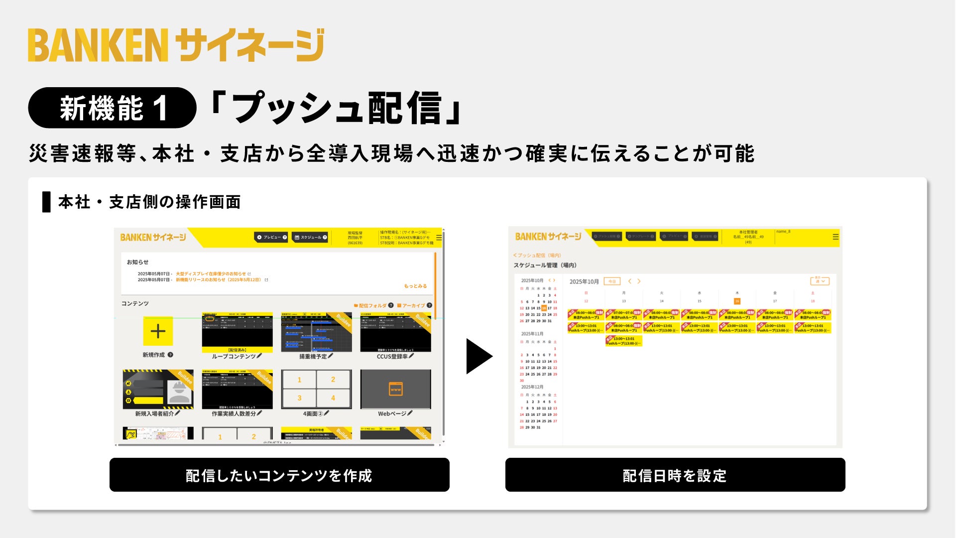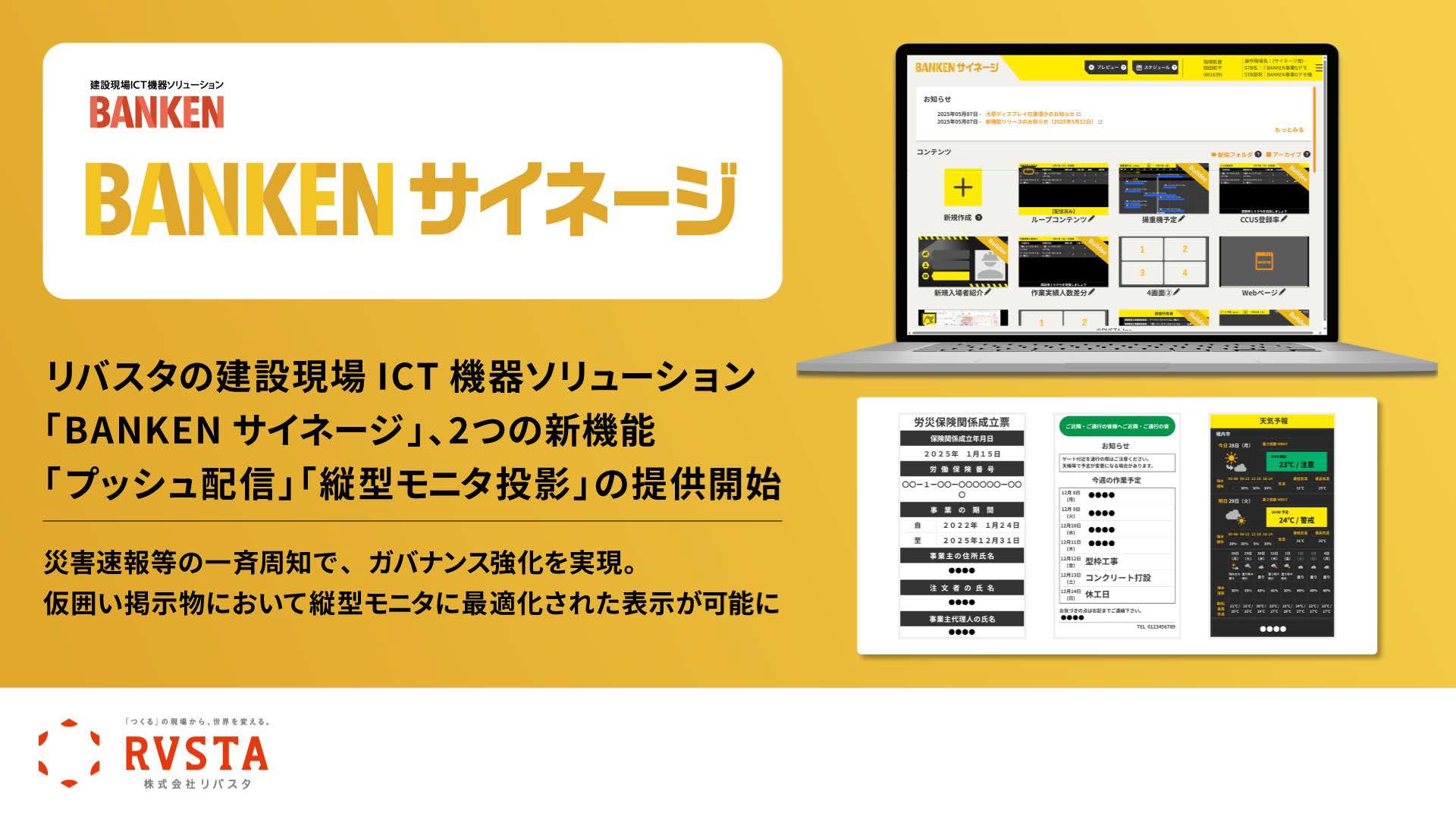 株式会社リバスタ(本社:東京都江東区、代表取締役:高橋巧、以下 当社)は、建設現場ICT機器ソリューション「BANKEN(バンケン)」のデジタルサイネージ「BANKEN サイネージ」において、建設現場の安全性確保や作業効率向上等を支援するため、新機能として「プッシュ配信」および「縦型モニタ投影」の提供を開始したことをお知らせします。