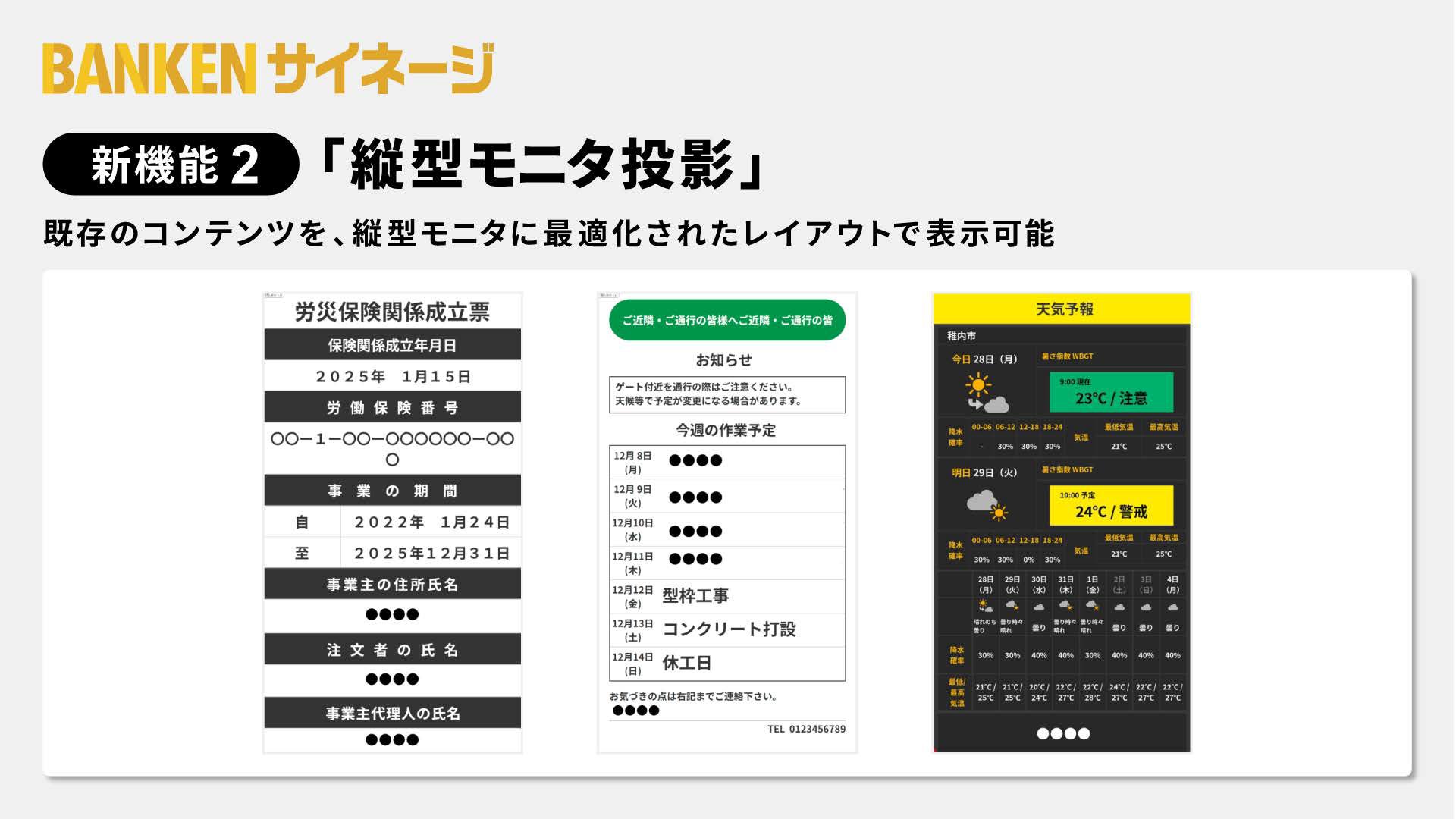 仮囲いに設置されるデジタルサイネージには、通行者向けの情報として労災保険関係成立票(※3)や作業予定表等、縦長の掲示物が多く掲出されている中、表示を最適化させるため、「BANKEN サイネージ」に「縦型モニタ投影」機能も追加しました。
