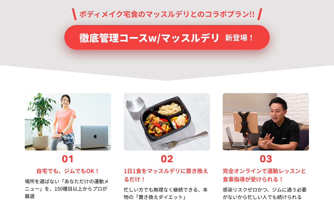 ボディメイクをしたい人の強力な味方であるウィズフィットネスとマッスルデリは、この度共同で、食事改善と運動指導の両面でボディメイクを成功に導く新プラン「徹底管理コースw/マッスルデリ」をリリースします。ウィズフィットネスのパーソナルトレーニングでは、アプリを使って日々の運動や食事を記録し、トレーナーからフィードバックをもらいますが、忙しい方にとって、毎回の食事で栄養素をバランス良く摂取することは大変なことです。そこで、毎週ご自宅にマッスルデリをお届けし手軽にバランス良く召し上がっていただくことで、運動や食事の知識を身につけていただき、理想とするカラダ獲得のサポートをいたします。