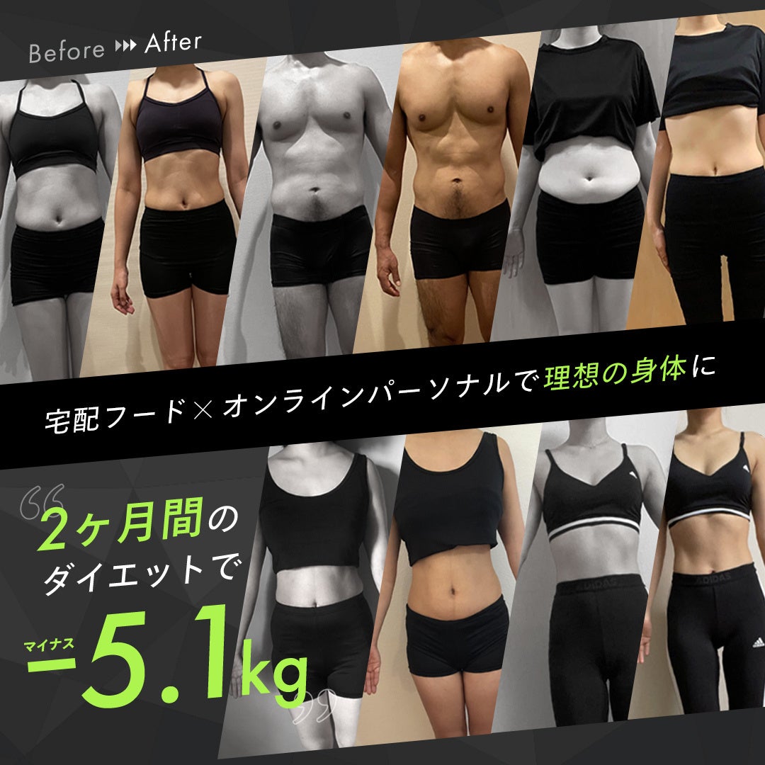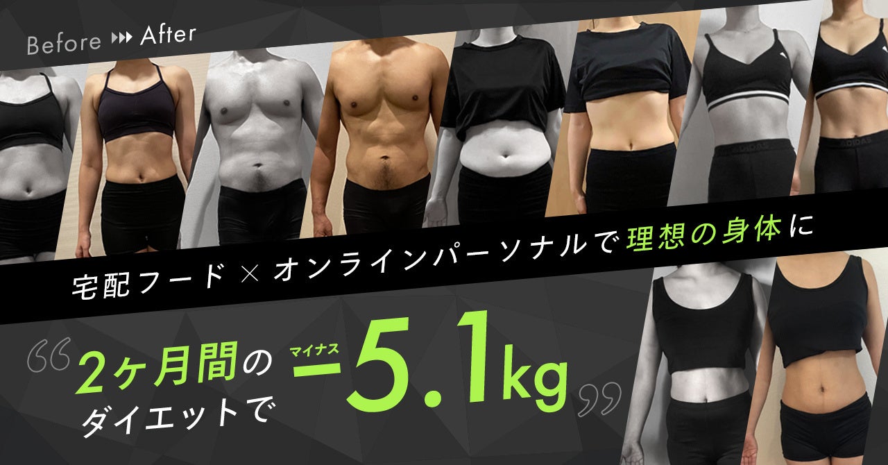 参加者の皆さまに2ヵ月間、ウィズフィットネスの月2回のオンラインパーソナルトレーニングとマッスルデリを毎週5食お届けし、ボディメイクを行って頂いた結果、最大でマイナス5.1kgのダイエットに成功された参加者もいらっしゃいました。