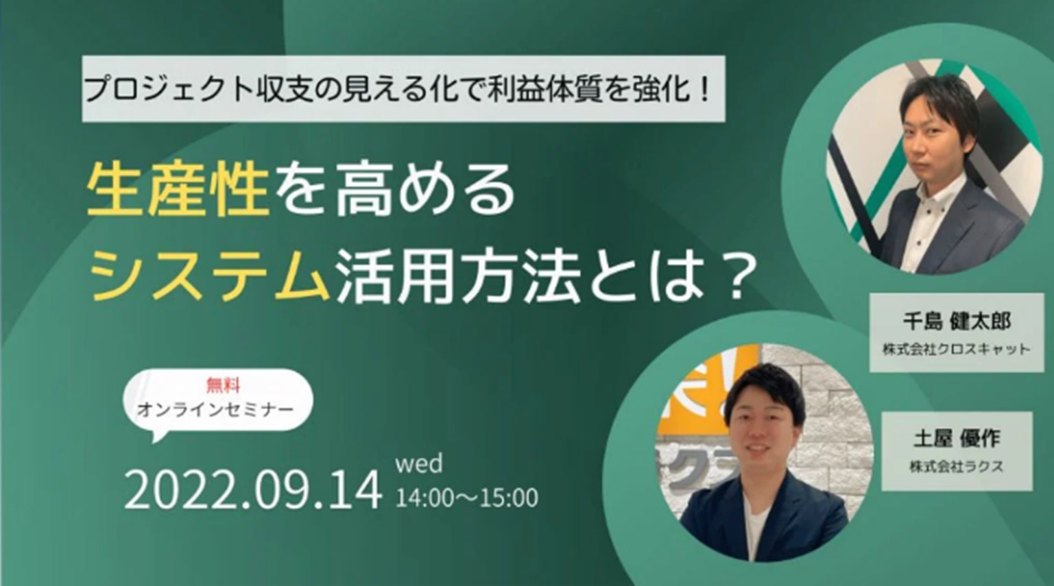 株式会社クロスキャット(本社:東京都港区、代表取締役社長:井上貴功)は、9月14日(水)14:00、クラウド型販売管理システム「楽楽販売」を提供する株式会社ラクス(本社:東京都渋谷区、代表取締役:中村崇則)との協業の一環として、共同Webセミナー「プロジェクト収支の見える化で利益体質を強化!生産性を高めるシステム活用方法とは?」を開催いたします。