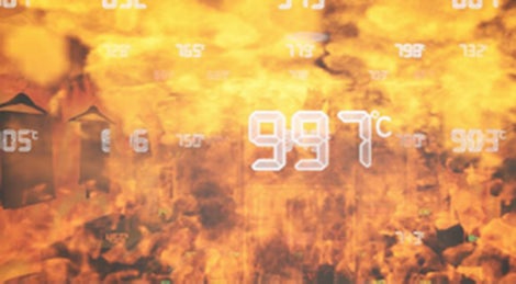 時間経過とともに推移していく火災現象を正確にとらえたバーチャル映像に、120カ所の温度測定データを数字として可視化することで、火災進展時の温度変化を確認