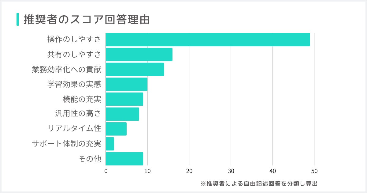 また、推奨者の自由記述によるスコア回答理由を分類すると、幅広い授業スタイルに対応し、シンプルでスムーズなスクールタクトの操作性が最も支持されている結果となりました。そして、先生と児童生徒、児童生徒同士での教材や回答の共有のしやすさも多くの方に評価されており、記述内容から授業における協働的な学びの促進につながっていることもうかがえました。