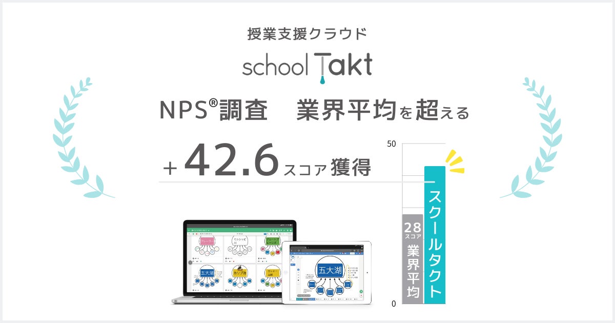 株式会社コードタクト(本社:東京都渋谷区、代表取締役:後藤 正樹、以下「当社」)の授業支援クラウド「スクールタクト」は、スクールタクト/ClassiNOTEで先生・管理者アカウントを持つユーザーを対象に、顧客ロイヤリティを数値化するNPS(ネットプロモータースコア)調査を実施。業界平均とされる+28を超える+42.6スコアを獲得しました。