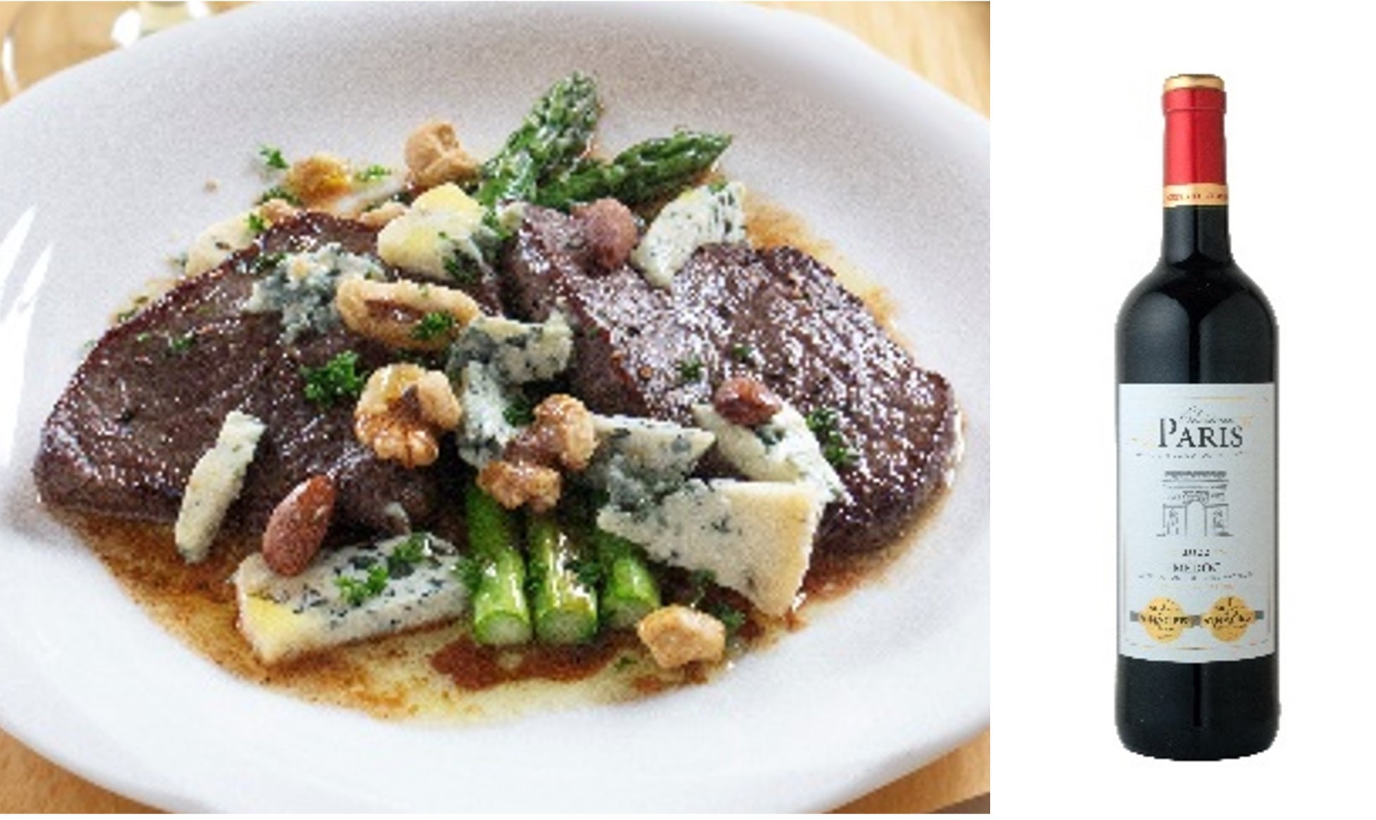 フランス料理のソースづくりは難しいイメージですが、フランスでは、ソース替わりに旨みの強いチーズを使うこともあります。こちらは、ソース要らずの簡単ステーキレシピ。焼いたステーキ肉にブルーチーズと燻製ナッツを合わせれば、風味豊かな味わいが広がります。火入れしやすく時短になるため、厚みの薄いステーキ肉を使うのがポイントです。おすすめのペアリングは、フランス・ボルドー・メドック地区の赤ワイン「2022 CHパリ」(750ml、2,189円)。豊かな骨格感と余韻の長さ、心地よい渋みと凝縮された果実感が特長で、牛肉やブルーチーズの濃厚な旨みと相性抜群です。