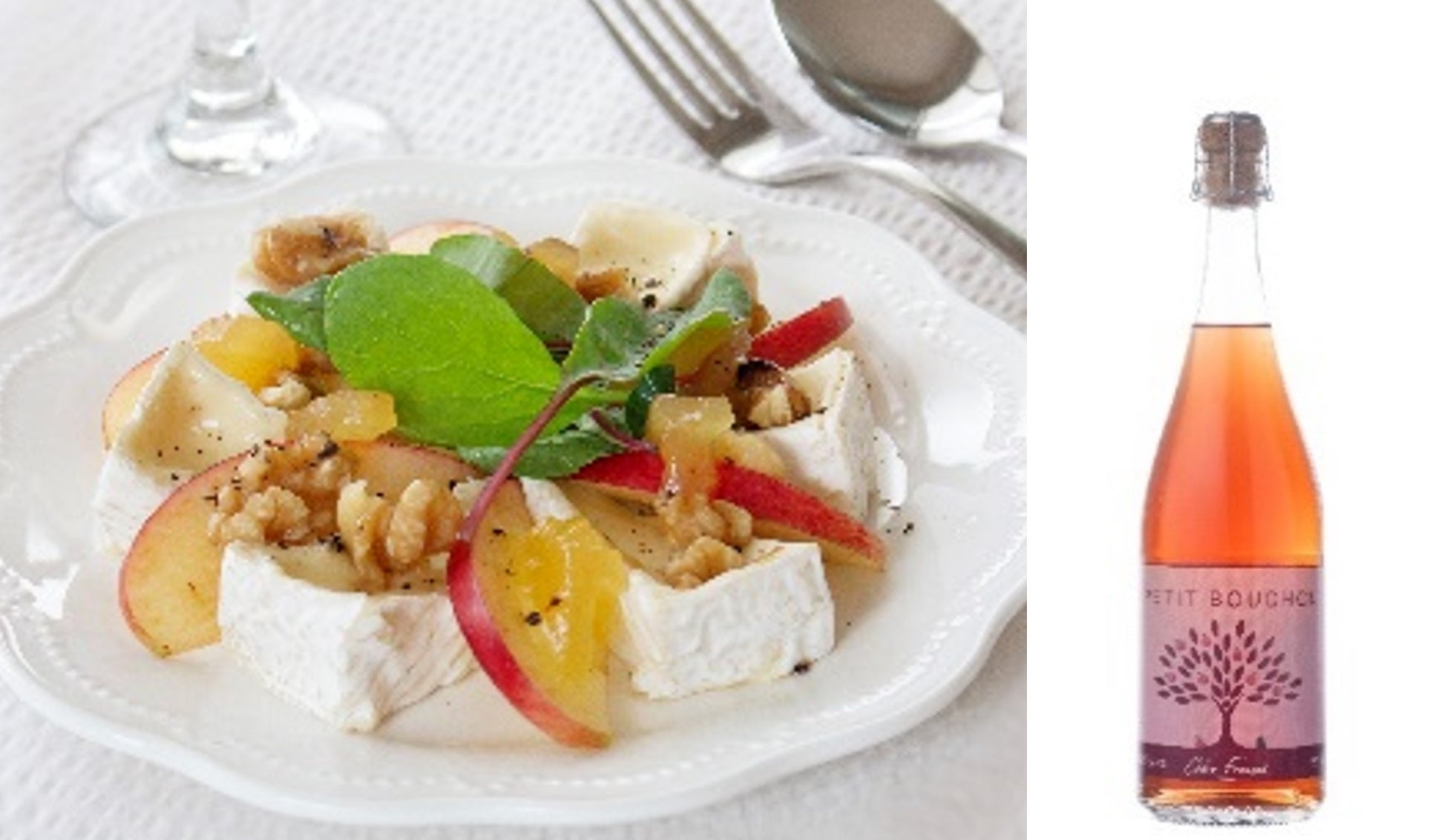 カマンベールチーズとりんごを組み合わせた前菜。食材をカットし、りんごジャムを蜂蜜やオリーブオイルと混ぜ合わせたソースをかけるだけの簡単レシピに仕上げました。最後に振りかける、くるみとブラックペッパーがアクセント。シンプルだからこそ、食材の相性の良さが際立つ一品です。バイヤーおすすめのペアリングは、「シードル プティ ブション」(750ml、1,639円)。こちらは、りんご×りんごの組み合わせで、りんごの甘酸っぱく爽やかな味わいがカマンベールチーズのコクとマッチします。氷を入れて涼やかにお楽しみいただくのもおすすめです。