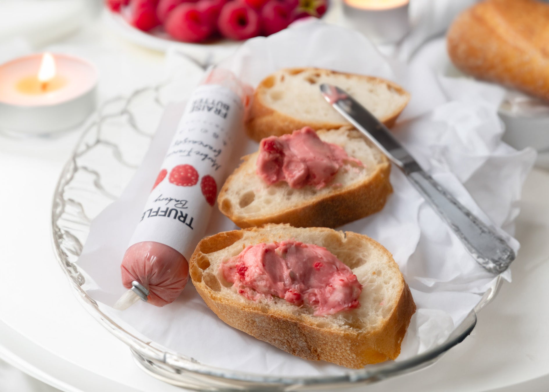 フランスの食文化をお届けしたいという想いで本フェアに向けて開発したTruffleBAKERYとの共同開発商品第3弾。フランスで乳製品と合わせて食することの多いフランボワーズを使用し、塩味のないスイーツ系バターを開発しました。フランボワーズの香りや風味、食感をお楽しみいただけるよう、フランボワーズホール、ピューレ、ダイスを使用。また、ミルクやバニラの繊細な香りとなめらかな舌触りが特長のフランスのショコラブランド「ヴァローナ」のホワイトチョコレート(カカオ分35%)を加え、酸味と甘みのバランスのとれた味わいに仕上げました。パンはもちろんのこと、パンケーキやフレンチトーストと一緒にお楽しみいただけます。甘さが足りない場合は、はちみつをかけていただくのもおすすめです。少し塩気を足すと、鴨肉などの肉料理のソースとしても使えます。