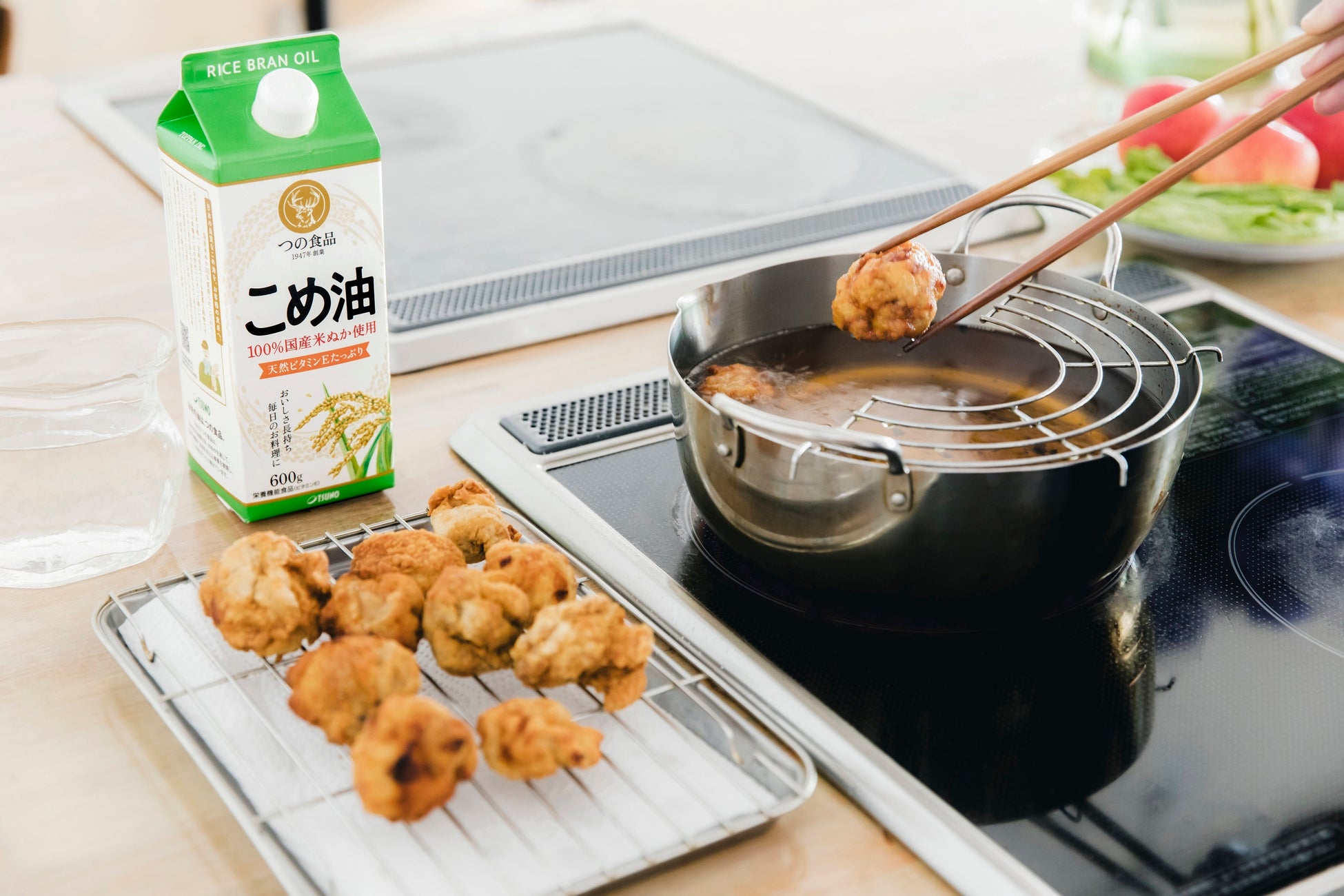 こめ油は、100%お米を原料とした玄米由来の栄養が豊富に含まれており、素材の味を引き立てる風味の良さが特徴。炒めもの、揚げもの、ドレッシングなど、どんなお料理にも美味しくお使いいただけます。