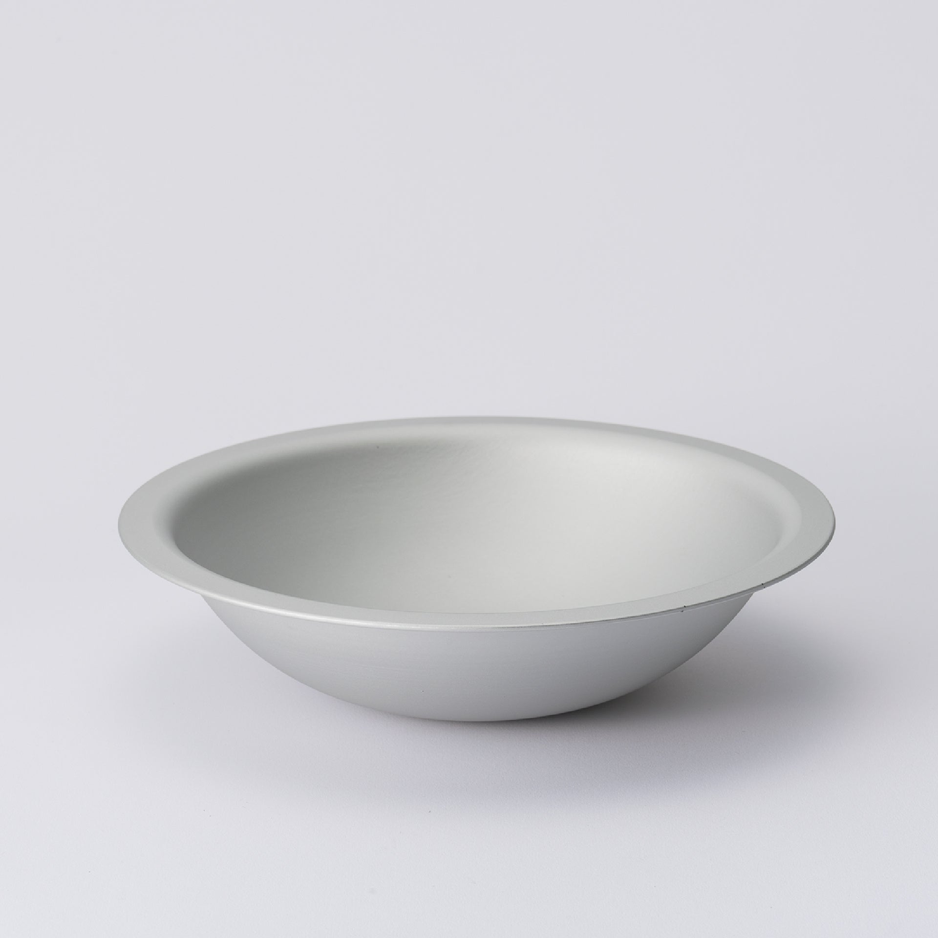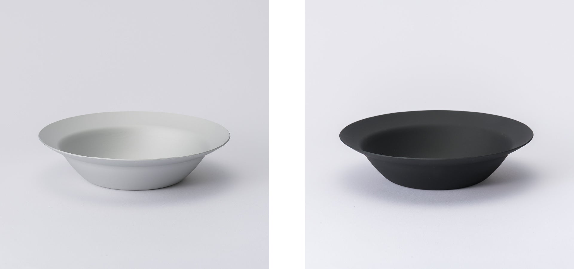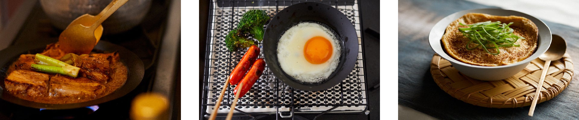 で一枚ずつていねいに成形し、ブラスト加工で洗練された渋みのある質感が特徴です。防食しながら表面の強度を高める厚膜アルマイト加工で仕上げているので3mmの厚みと表面加工が傷や焦げも受け止め、熱伝導率もほどよく調整します。タフに使い込んでいくなかでデニムのような風合いの変化が楽しめるのが特徴です。