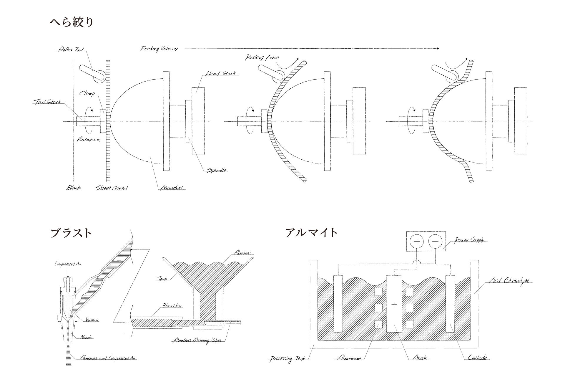 型に円盤状の金属を取り付け、「へら」と呼ばれる棒状の道具を押しあて高速回転させながら徐々に引き伸ばすようにして成形させていく加工です。