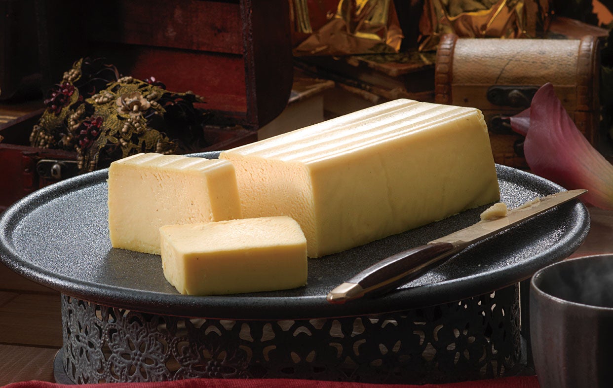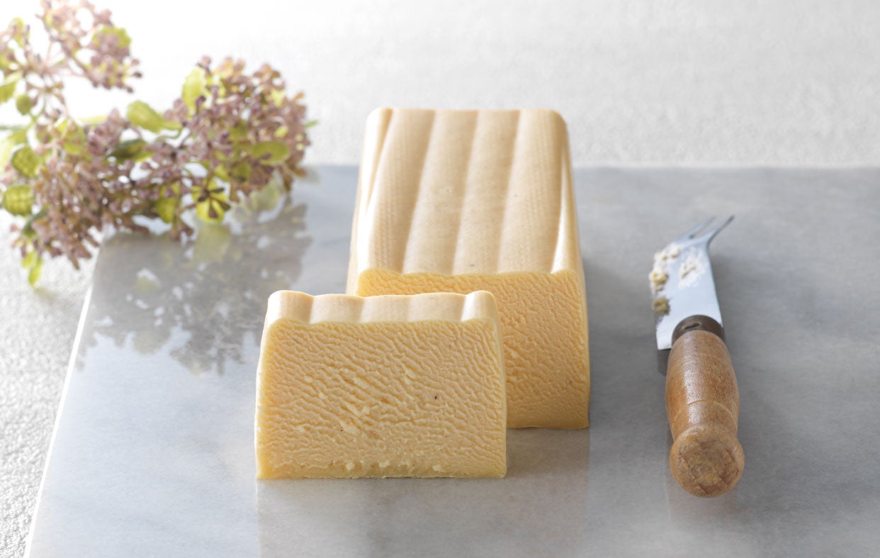 クリームチーズとカマンベールチーズ。 一見相反する2つの異なる味わいをまとめるために試行錯誤した結果 あるひとつの食材にたどり着きました。 兵庫県にある共進牧場様の「ジャージー乳」は濃厚でコク深く、異なるチーズの風味をまろやかにまとめながら、かつお互いを引き立たせる最高のめぐり合わせでした。 口溶けに極限までこだわっているため、ナイフで切ると形が崩れてしまうほど柔らかく繊細なテリーヌ。 くるっと糸で巻いて切ることで簡単に美しい断面にすることが出来ます。
