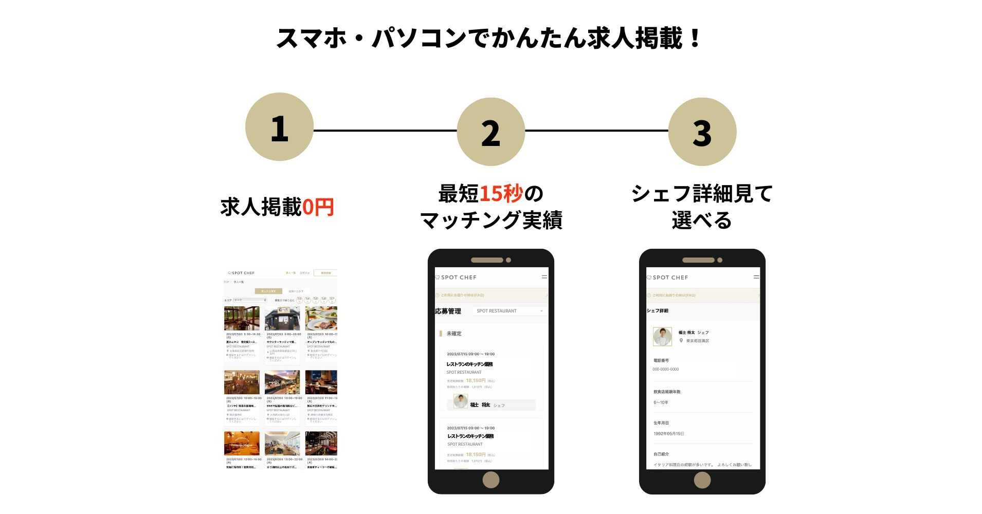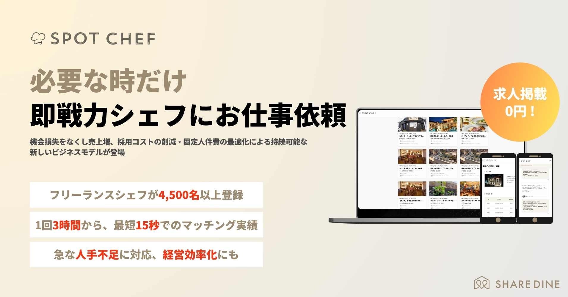求人掲載は無料です。掲載をご希望の方はオフィシャルサイト(https://spot-chef.com/home/restaurant/)より、お問い合わせ下さい。