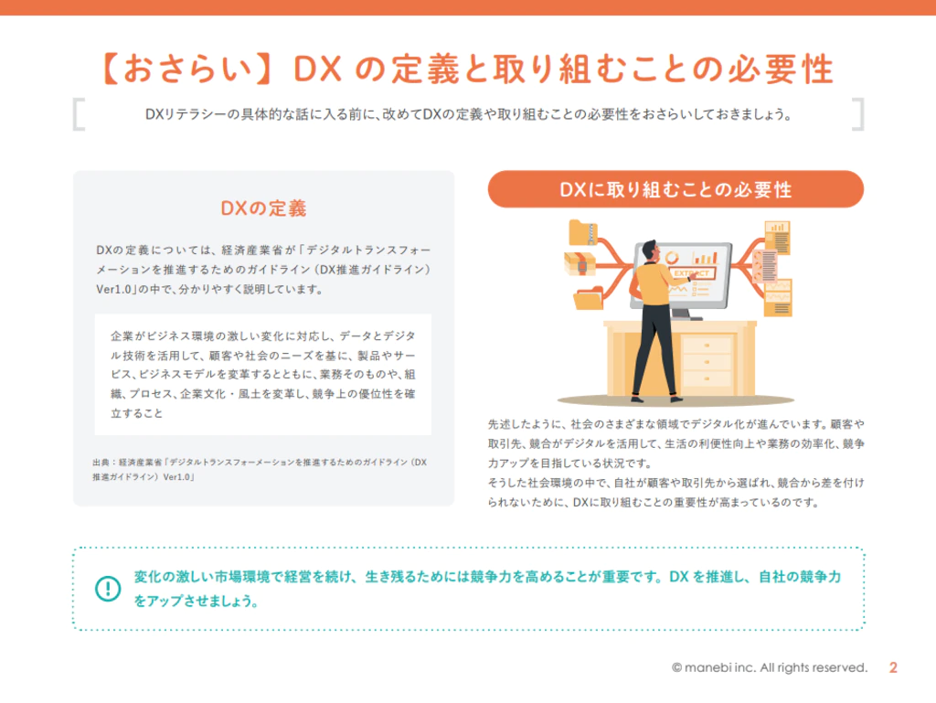 本資料では、DX推進担当者・対象部門それぞれが身に付けるべきDXリテラシーについて解説しています。