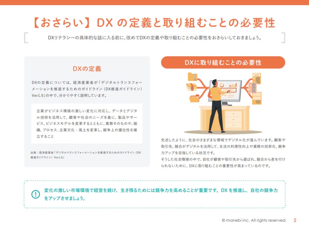社員教育を支援するラーニングエクスペレエンスプラットフォーム「playse.(プレース)」を提供する株式会社manebi(東京都千代田区 代表取締役執行役員CEO:田島 智也 以下、manebi)は、DX推進企業向けに「DX推進担当者・対象部門が身に付けるべきDXリテラシー」についてのお役立ち資料を公開いたしました。無料でご覧いただけます。