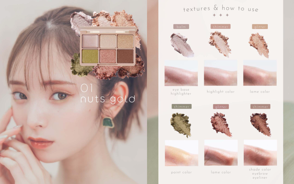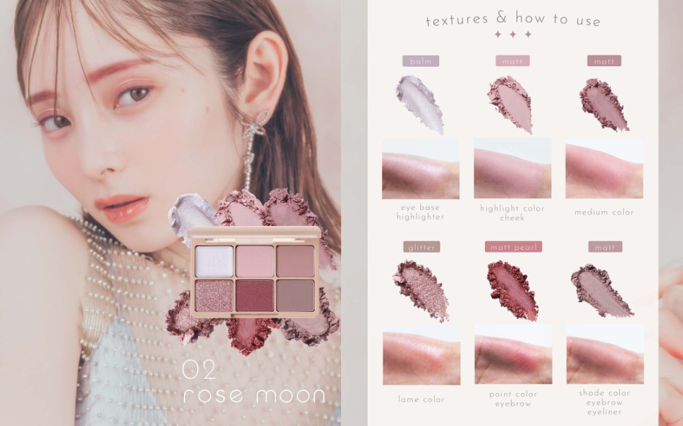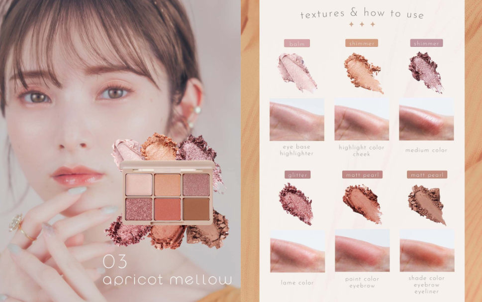 バーム 、シマー、マット、グリッターなど異なる質感の 6 色が1パレットになったアイシャドウは、ハイライトやチーク、アイブロウなどにもご使用いただけるマルチパレットとなっています。