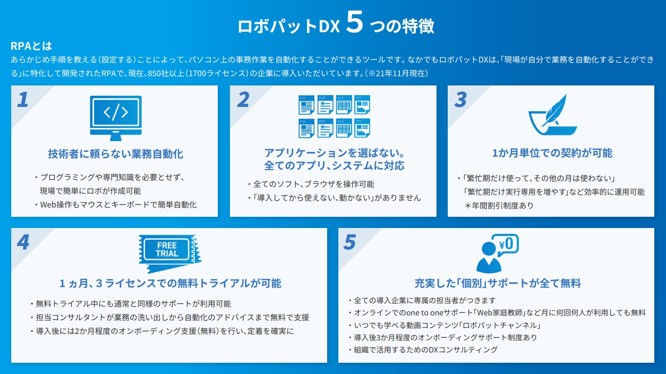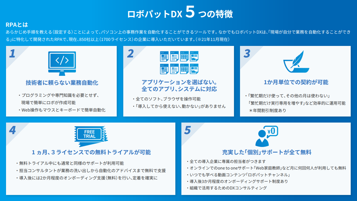 「業務プロセスを新たなテクノロジーによって『構造的』に革新し、人の『価値ある時間』を創り出す」という理念のもと『RPA Robo-Pat(ロボパット)DX』を通して、企業の業務改善の機会をご提供します。