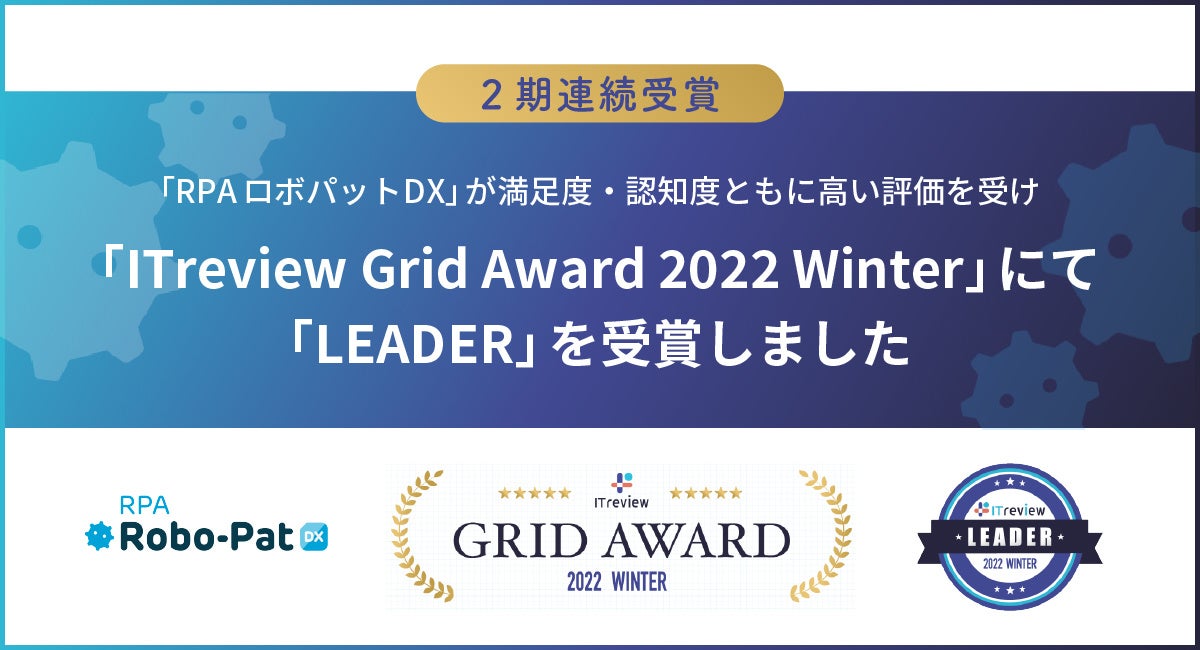 【2期連続受賞】『RPAロボパットDX』が満足度・認知度ともに高い評価を受け「ITreview Grid Award 2022 Winter」にて「LEADER」を受賞しました