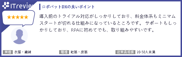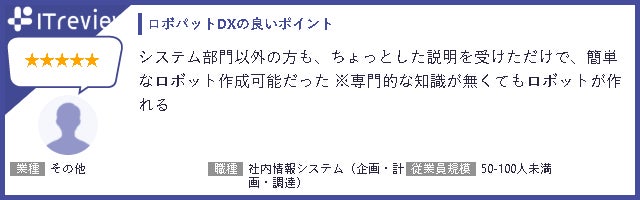 株式会社FCEプロセス&テクノロジー(東京都新宿区、代表取締役社長:永田純一郎)は、アイティクラウド株式会社(以下:アイティクラウド 本社:東京都港区、代表取締役社長:黒野 源太)が主催するアワード「ITreview Grid Award 2022 Winter」において、当社が提供する純国産RPA『RPA Robo-Pat DX(以下、RPAロボパットDX)』が、満足度・認知度ともに優れた製品に贈られる「Leader」を受賞したことをお知らせいたします。