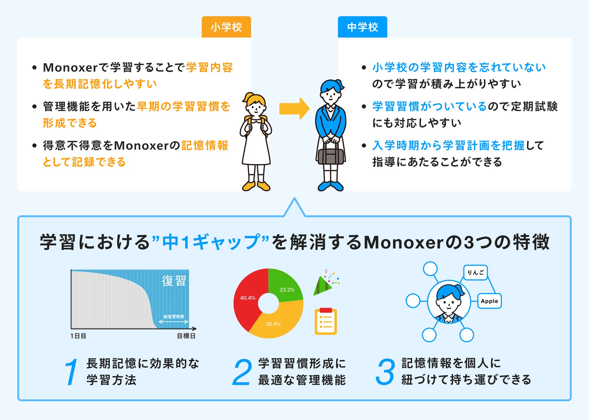 Monoxerでは、児童・生徒の学習データを記憶情報として「個人ごと」に記録・持ち運びを可能としているので、小学校での学習内容の習熟度を正確かつリアルタイムに中学校と共有することが可能です。