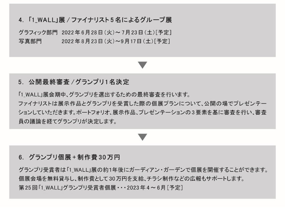 「1_WALL」は、新しい表現を追求し続けている若い才能を発掘することを目的としたコンペティションです。グランプリ受賞者には、約1年後のガーディアン・ガーデンでの個展の開催の権利と、個展制作費として30万円が贈られます。