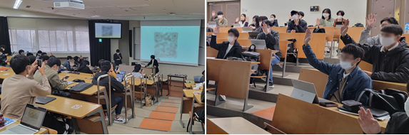 とくに「クレジットカードを紛失した場合の対処」や「フィッシングメール対策」は、すぐにでも発生し得る身近なトラブルへのアドバイスとして、真剣に聴講している姿が印象的でした。講義中は、スマートフォンによる書き込みで随時質問を受け付け。また、挙手によるアンケートも行い、一方通行ではなく、インタラクティブな講義となりました。
