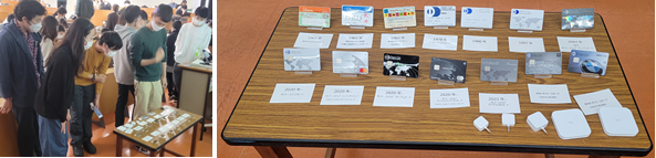 当日は、歴代のダイナースクラブカードのサンプルやクレジットカード決済端末機を資料として展示。休憩時間になると多くの学生が周囲に集まり、興味深げに覗き込み、メタルカード(金属製)を手に取って重厚さを実感していました。
