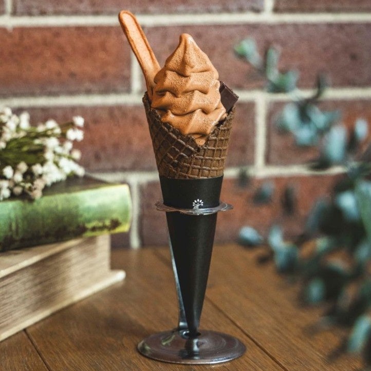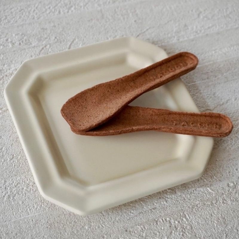 従来、ソフトクリーム提供時には使い捨てスプーンを使用していましたが、今年から数量限定で食べられるサステナブルスプーンを導入いたします。自社でチョコレートを製造するときに出る副産物のココアパウダーを配合し、ソフトクリームにもマッチするほんのりカカオの風味が感じられるクッキーのような食感に仕上がりました。ご使用後にゴミが発生することのない、環境にやさしいスプーンです。環境に配慮しているだけでなく耐水性に優れ、ソフトクリームと一緒に食べてもふやけずに最後の一口まで美味しくお召し上がりいただけます。