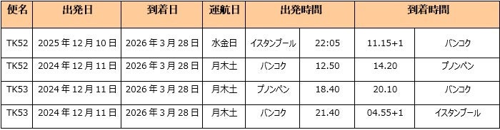 ターキッシュ エアラインズは、バンコク経由でプノンペンへの便を運航します。フライトは週3便の運航で、水曜日、金曜日、日曜日にイスタンブールからプノンペンへ、月曜日、木曜日、土曜日にプノンペンからイスタンブールへ出発します。