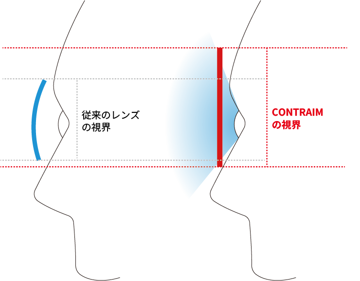 縦方向にカーブが無いため、視界ほぼすべてをレンズで覆うことができ、これまでにない広く、光学的に優れた広い視界を実現します。