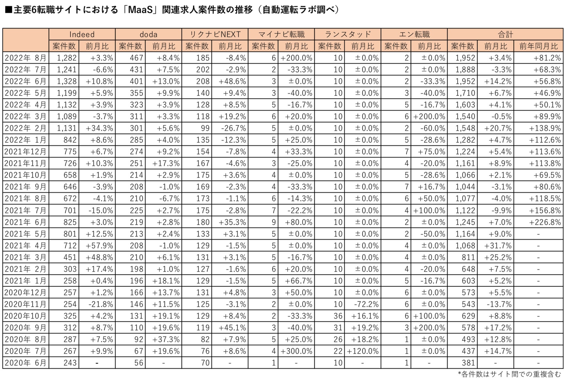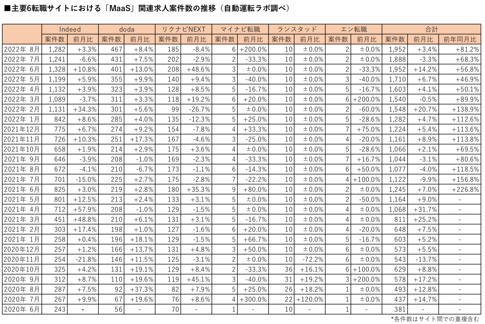 「MaaS」の関連求人案件数(主要転職6サイト)は2022年8月末時点で、前月比3.4%増、前年同月比81.3%増の1,953件となりました。2022年6月に記録した1,952件を上回り、過去最高となっています。