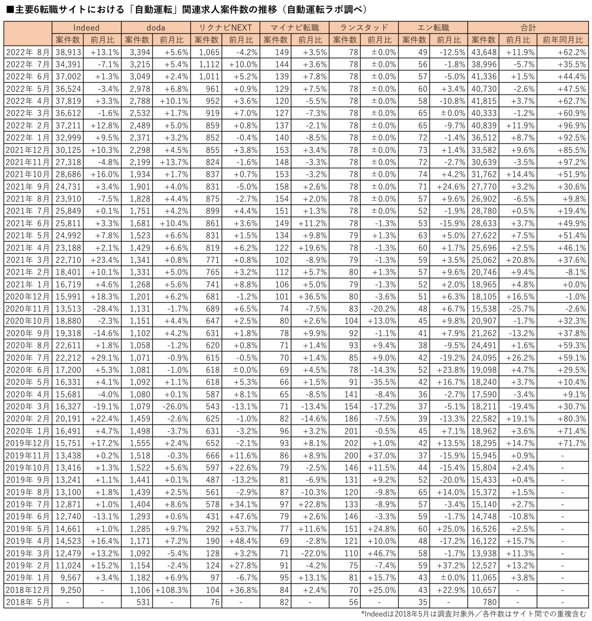 「自動運転」の関連求人案件数(主要転職6サイト)は2022年8月末時点で、前月比11.9%増、前年同月比62.2%増の43,648件となりました。2022年6月の41,336件を抜いて、過去最多の件数となっています。