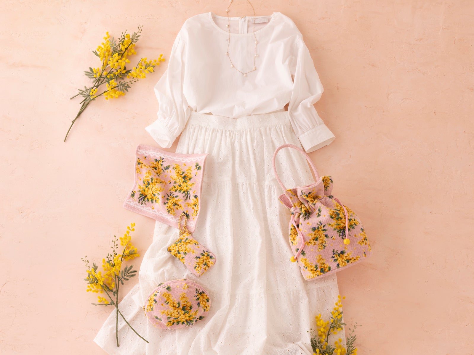 (写真左から)バッグ¥24,200(約22×22×12cm)、巾着¥6,600(約18×14.5cm)、エチケットポーチ¥8,250(約12×12cm)、ポーチ¥7,150(約10×14.5×4.5cm)