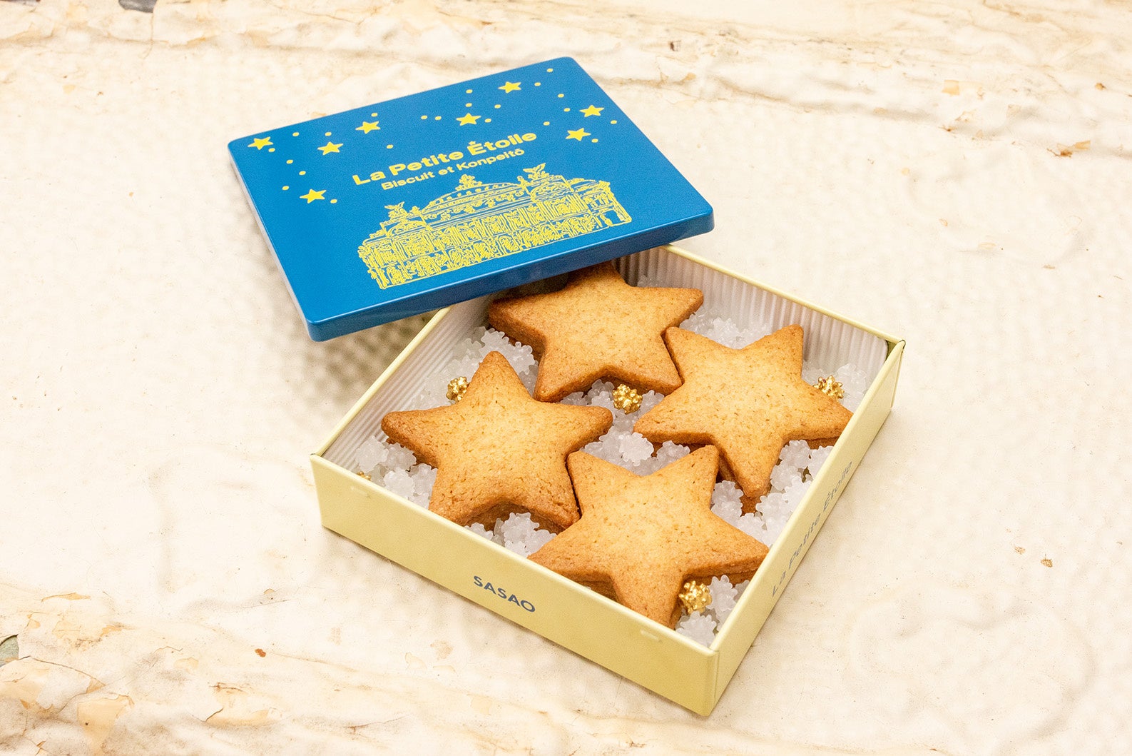 笹尾の描くオペラ座がパッケージデザインになった缶に12枚の星のビスケットと金と白の金平糖が詰め込まれています。