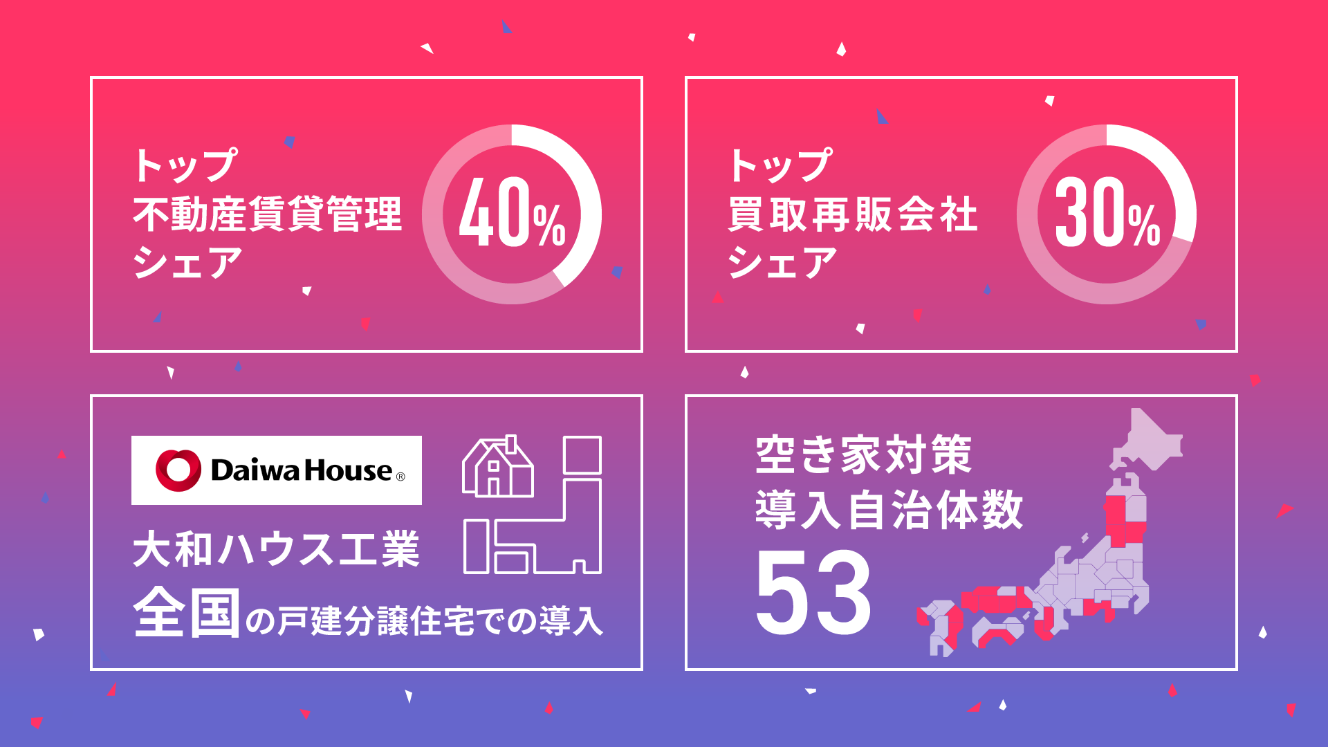 〜管理戸数ランキングトップ100の不動産賃貸管理シェア40%、買取再販ランキングトップ20のシェア30%、大和ハウス工業の全国の戸建分譲住宅での導入、空き家対策として53の自治体が導入!〜