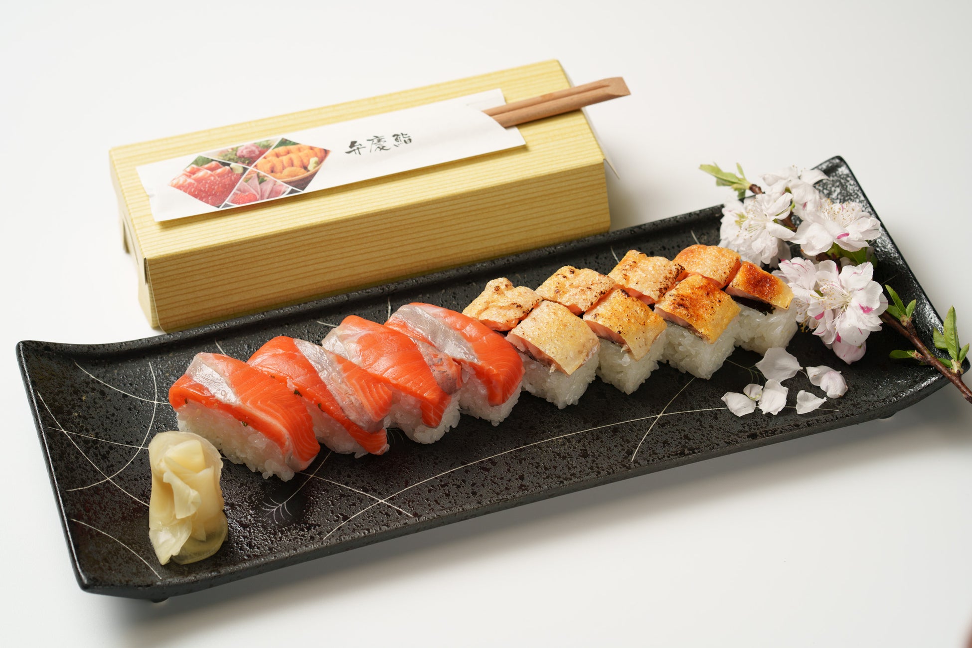 南三陸サーモンの酢〆とハラス焼2種類の押し寿司