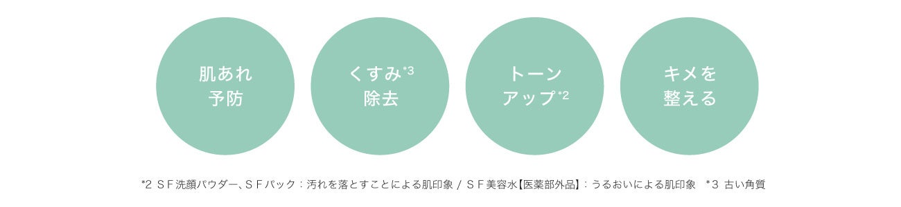 *1 SF洗顔パウダー、SFパックパウダー:清浄成分 / SF美容水【医薬部外品】:有効成分 *2 SF洗顔パウダー、SFパック:汚れを落とすことによる肌印象 / SF美容水【医薬部外品】:うるおいによる肌印象 *3 古い角質