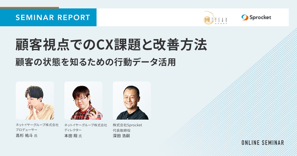 当日は、Sprocketの代表取締役である深田浩嗣が、ネットイヤーグループ株式会社の高杉祐斗氏と本田翔氏とともに「自社データをCX観点で活用し、ビジネスの課題を解決していく方法」について語りました。