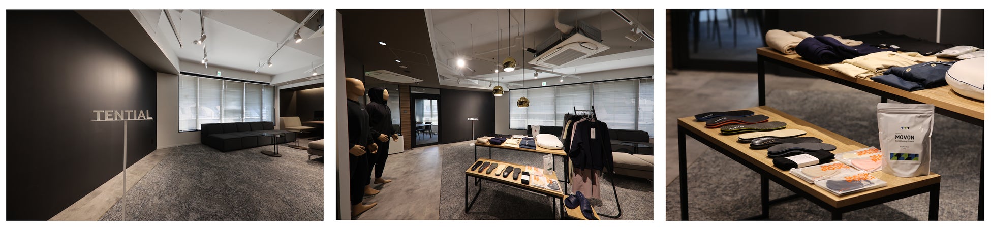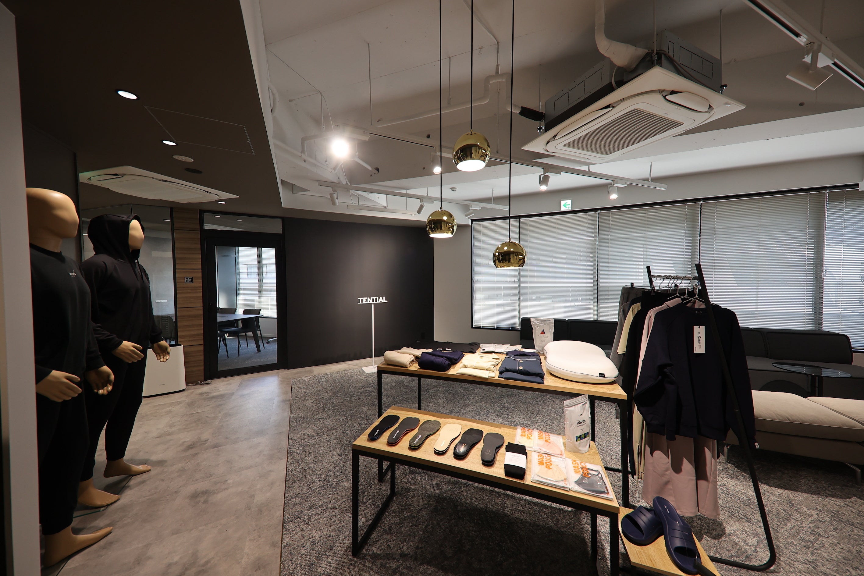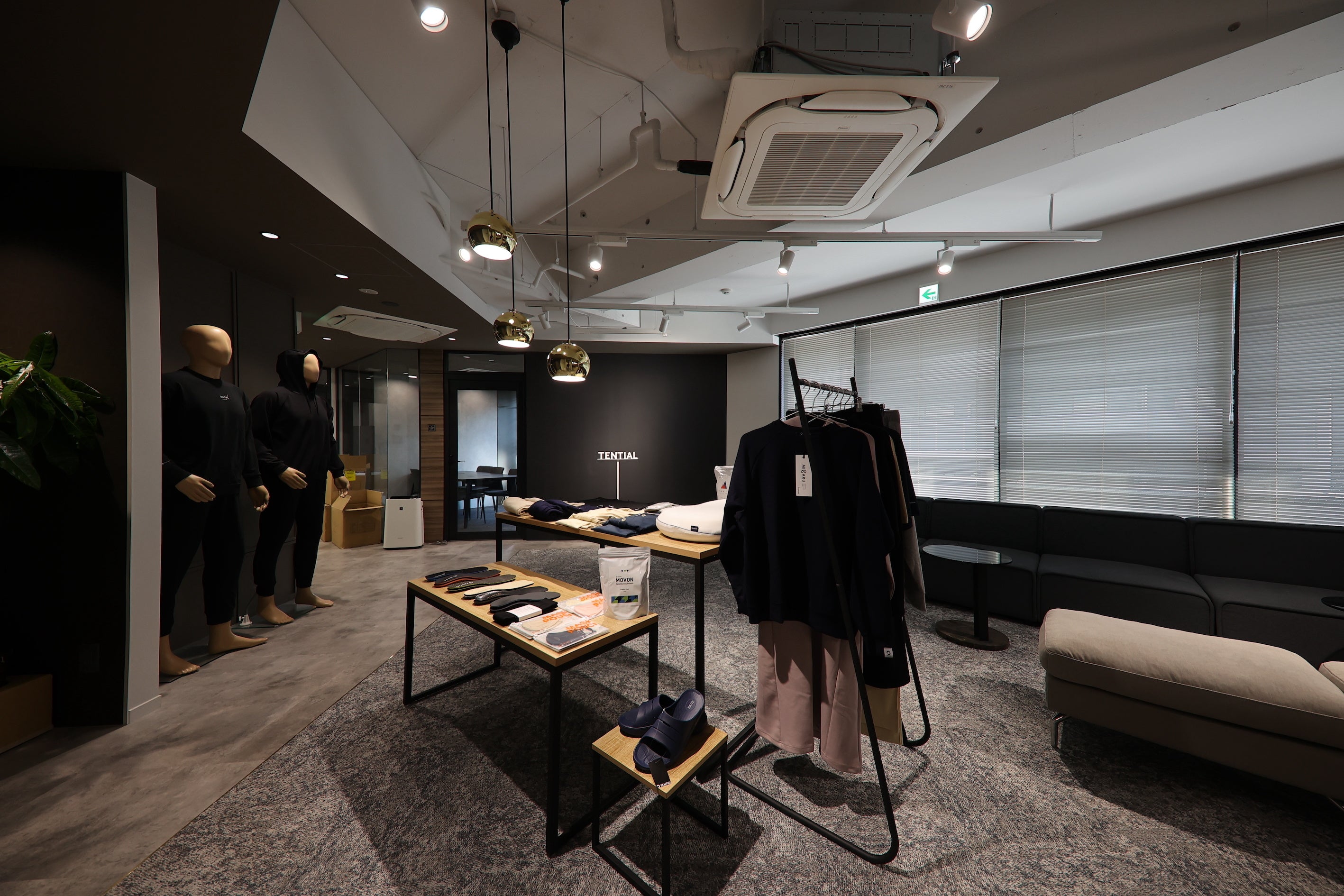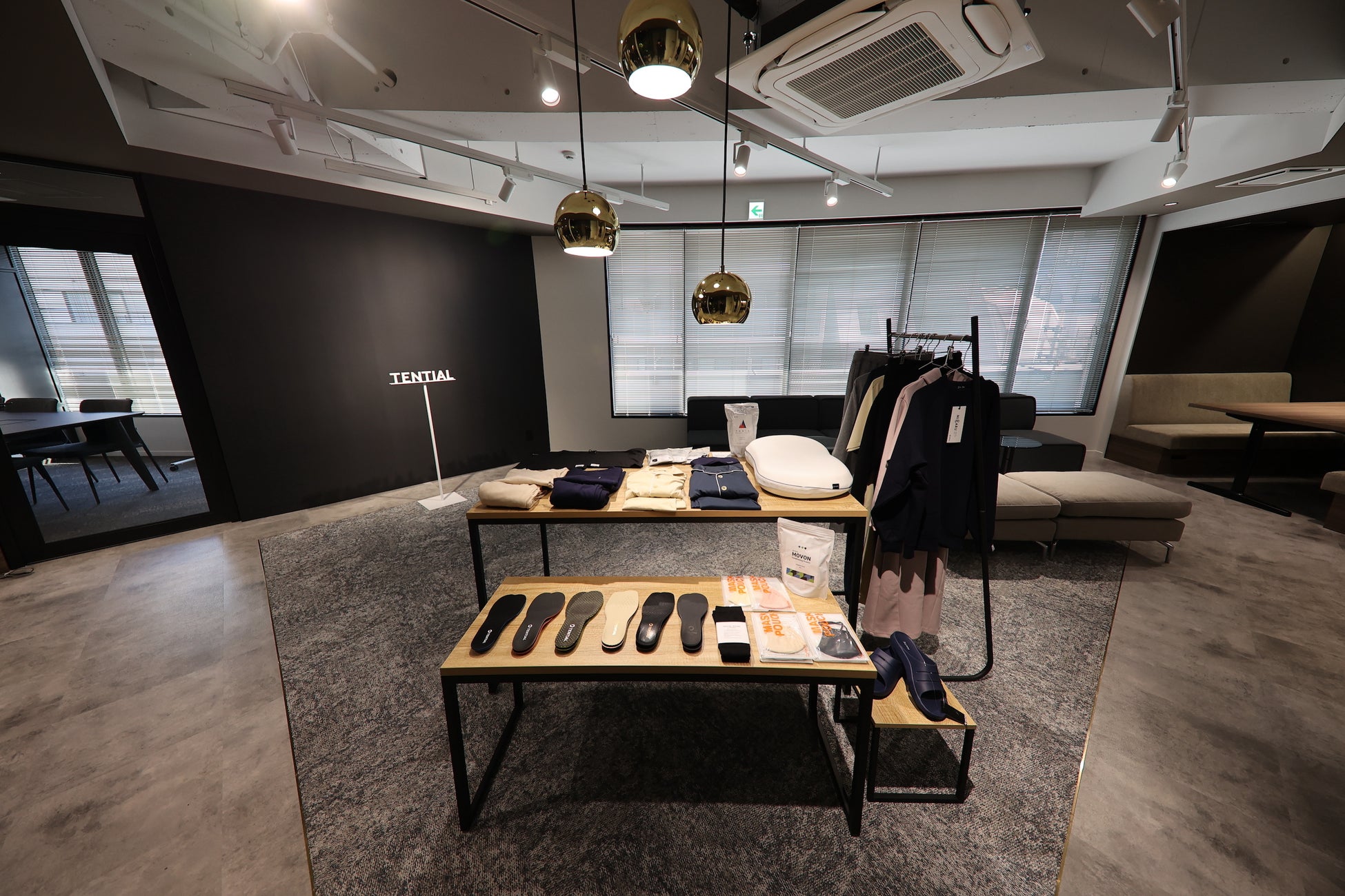 オフィスに訪問いただいた方に、よりテンシャルを知っていただきたいと考え、エントランスには「TENTIAL」製品の展示スペース『TENTIAL Showcase』を新設いたしました。主にオンラインで展開している製品を、実際に触れることができ、製品の機能性やこだわりを感じられるような空間となっています。