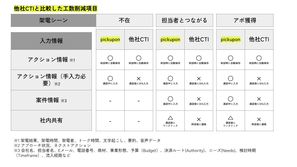 会話サマリーAI電話「pickupon(ピクポン)」は、AIが電話で話した内容のサマリーをテキスト×音声で作成し、自動入力・共有してくれるサービスです。入力を意識せず、顧客との会話内容をチームのワークスペース(CRM・SFAなど)へシェアします。これにより、営業の架電シーンにおける入力漏れを防ぎ、入力コストを削減し、営業活動のブラックボックス化問題を解決します。当サービスは2019年9月の提供開始以来、スタートアップ企業を中心にユーザー数が増加し続けています。