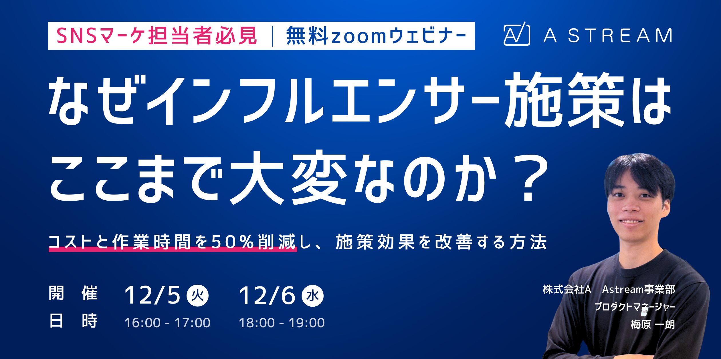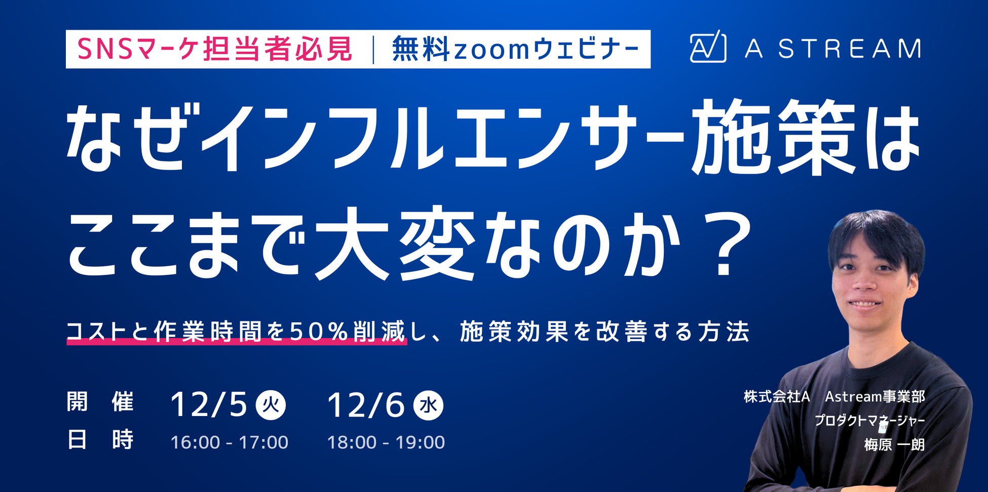【申し込み期間延長】インフルエンサー検索ツール「Astream」が12/5・6に無料ウェブセミナー開催決定!SNS担当者の抱える悩みを年内に解決します!