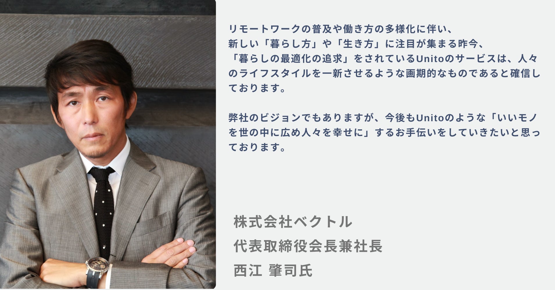 Unitoは、「暮らしの最適化」というビジョンの実現に向けて、帰らない日は家賃がかからないホテルレジデンスの運営、最短即日・スマホ契約が可能な家具家電付きのお部屋を探せるプラットフォーム「unito」の運営を行っています。