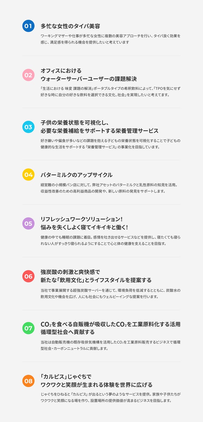 今回の取組みを通して、人と社会、自然が共に「Well-being」であり続ける未来を創造するため、アサヒ飲料様と共に挑戦できることを非常に嬉しく思います。また、飲料のみならず、美容や健康、本来捨てられる物質の再利用など、幅広い事業創造を行うことで、持続可能な未来の実現に貢献してまいります。共に新しい価値を創出していける仲間を探していますので、今回の取組へのご応募、ぜひともお待ちしております。